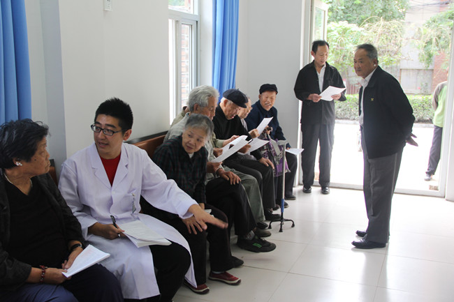 活動現場氣氛熱烈,分為體質測評區,問診區,推拿按摩區,耳針治療區四個區域。中醫專家們正在進行問診,分隊成員指導老教師填寫問卷,為老教師進行推拿按摩、耳針治療,并在治療完成后,攙扶老教師離去。