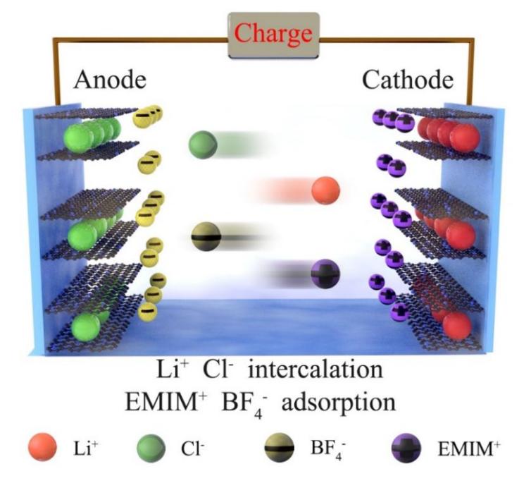 當(dāng)前,二次電池和超級電容器是兩種主流的電化學(xué)儲能器件,然而傳統(tǒng)搖椅式電池受限于緩慢的電化學(xué)氧化還原過程表現(xiàn)出相對較差的功率密度,超級電容器基于快速的表面吸脫附過程存儲電荷,往往具備較高的功率密度,但是能量密度不足。二者都無法同時滿足對能量和功率密度有較高要求的應(yīng)用場景。為了獲得“雙高”(高能量密度、高功率密度)的電化學(xué)儲能器件。鑒于此,高勇軍教授課題組在其長期的功能化碳材料的研究基礎(chǔ)上,開發(fā)了一種基于LiCl/EMIMBF4雙鹽電解液的雙離子電池-超級電容器混合器件(DIB-SCHD)。該對稱型儲能器件的兩個電極都同時具有電池型和電容型電荷存儲機理。在充放電過程中,EMIM+、BF4-發(fā)生電容器型的吸附/脫附過程,而Li+、Cl-發(fā)生電池型的插層/脫層反應(yīng)。離子插層/脫層和吸附/脫附過程的高效協(xié)同機理賦予了DIB-SCHD同時具有高能量密度和高功率密度。