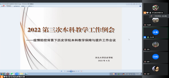 歷史學(xué)院按照學(xué)校疫情防控的總體要求,遵循師生健康為第一,不降低標(biāo)準(zhǔn),靈活實(shí)施的原則,有序開展本科線上教學(xué)活動。為全面摸清閉環(huán)管理以來學(xué)院教學(xué)狀況和學(xué)生學(xué)習(xí)狀態(tài),歷史學(xué)院用一周的時間全面調(diào)研學(xué)院本科教學(xué)工作狀態(tài),重點(diǎn)部署本學(xué)期教學(xué)的重點(diǎn)、難點(diǎn)工作,充分調(diào)動和發(fā)揮教研室的積極作用,利用線上互聽互評等小型教學(xué)研討、教學(xué)觀摩活動,全面探索教研活動的有效方式和方法,助力教學(xué)水平提升,為疫情防控背景下的本科教學(xué)保駕護(hù)航。2022年4月7日下午,歷史學(xué)院在前期調(diào)研基礎(chǔ)上組織召開了2022年第三次教學(xué)工作例會,圍繞“疫情防控背景下歷史學(xué)院本科教學(xué)保障與提升”通報調(diào)研結(jié)果,展開研討,規(guī)劃下一步的工作方向。院長肖紅松、教學(xué)副院長衣長春、系室主任、院級督導(dǎo)、教學(xué)秘書共計11人參加了此次會議。