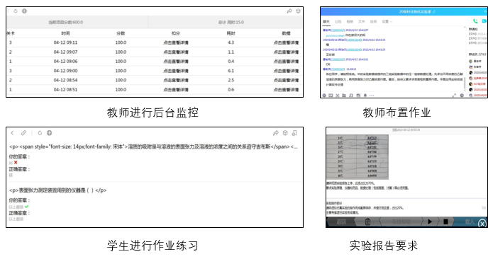 《基礎物理化學實驗1》共開設12個實驗項目,利用2021年開發建設完成的虛擬仿真實驗平臺,采用線上模式開展實驗教學。為最大限度保障線上教學效果,學院教師集體備課,精心準備課件,同時通過后臺監控、課堂練習、在線實時交流等方式設置互動環節,調動學生學習興趣。學生普遍反映這種模式新穎高效、具有一定挑戰性,在課下還可以利用手機自助反復演練,預習和復習也很方便,教學效果良好。
