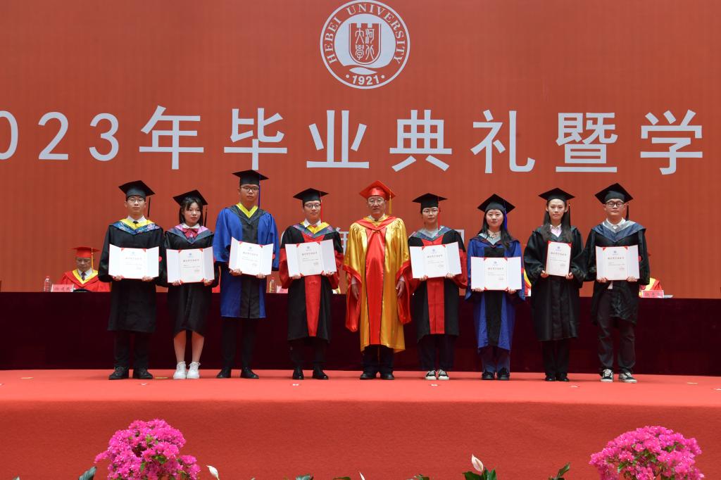 典禮儀式上,校長康樂院士向首批榮獲“康樂獎學金”的8名畢業生頒發證書。該獎學金由校長康樂院士攜夫人杜向榮女士于2021年中國共產黨成立百年、河北大學建校百年之際捐資設立,專項獎勵我校優秀青年學子。