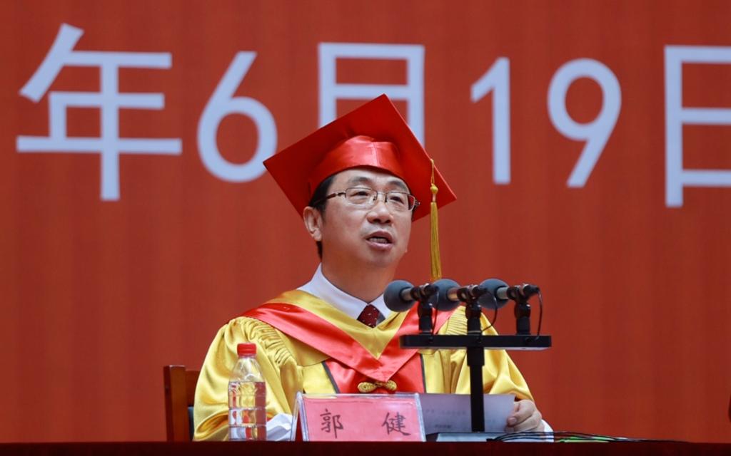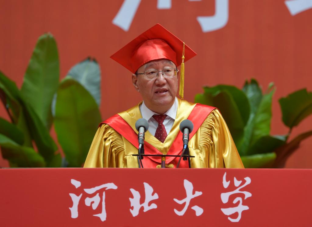 郭健在主持時表示,莊嚴而神圣的畢業典禮,是落實立德樹人根本任務的重要路徑,是值得畢業生永遠珍藏的美好記憶,愿畢業生有歲月可回首、有前程可展望。他強調,黨的二十大擘畫了以中國式現代化全面推進中華民族偉大復興的宏偉藍圖,同學們要堅定不移聽黨話、跟黨走,立志做有理想、敢擔當、能吃苦、肯奮斗的新時代好青年,矢志踐行“請黨放心,強國有我”的青春誓言。習近平新時代中國特色社會主義思想是全黨全國人民為實現中華民族偉大復興而奮斗的行動指南,同學們要做習近平新時代中國特色社會主義思想的堅定信仰者和忠實實踐者,自覺踐行社會主義核心價值觀,讓青春在建設教育強國、科技強國、人才強國的火熱實踐中綻放絢麗之花。他向畢業生深情叮囑,青春不止一群人,還有一個老地方,河北大學將永遠是你們乘風破浪的堅實后盾、筑夢前行的精神家園。不管走得多么遠、不管走到哪里,五年、十年、二十年、五十年,“河北大學”四個字,已經鐫刻在你們的人生履歷中,百年學府的精神,將永遠陪伴你們的奮斗征程。請帶著母校無限的祝福,從河北大學出發,向祖國報到!