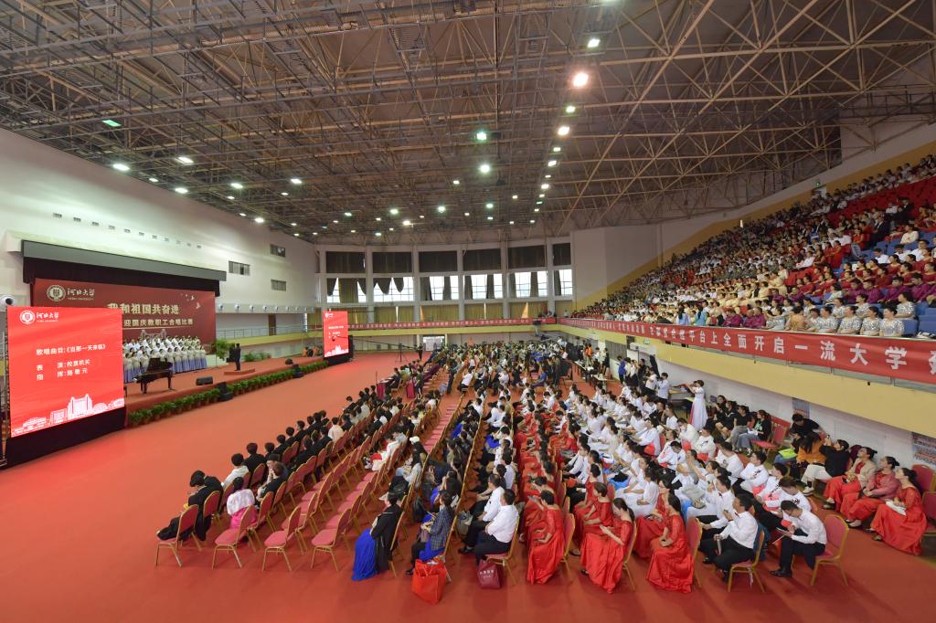 校黨委副書記楊立海在致辭中說,中華人民共和國成立74年來,取得了令世界刮目相看的偉大成就。黨的二十大擘畫了全面建設社會主義現代化國家、以中國式現代化全面推進中華民族偉大復興的宏偉藍圖,吹響了奮進新征程的時代號角。我校全面學習宣傳貫徹黨的二十大精神,深入開展學習貫徹習近平新時代中國特色社會主義思想主題教育,為強國建設、民族復興貢獻河大力量。目前學校“文科登峰”形勢喜人、“理工科振興”未來可期、“醫科崛起”曙光初現,百年強校之夢正在照進現實。躬耕教壇,強國有我。全校師生要更加緊密地團結在以習近平同志為核心的黨中央周圍,以教育之力厚植人民幸福之本,以教育之強夯實國家富強之基,為全面建設社會主義現代化國家而團結奮斗!
