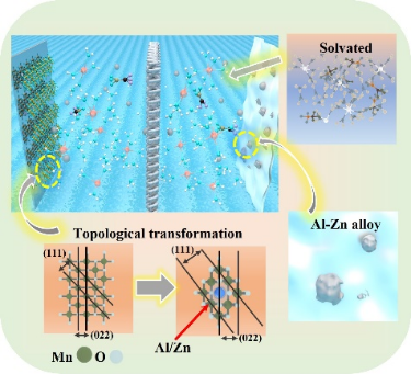 鋁含量豐富,具有很高的理論容量和體積能量密度。此外,水性鋁離子電池的高安全性使其成為大規模儲能系統的有力候選者。然而,正極材料結構坍塌和金屬鋁的溶解等問題導致水系鋁離子電池難以開發。在此項工作中,研究人員開發了一種新型電池系統,即Al-Zn/Al(OTF)3+HOTF+Zn(OTF)2/AlxZnyMnO2·nH2O。陰極采用MnO拓撲變換,保證陰極形成AlxMnO2·nH2O,拓撲變換改變了正極材料的結構,使Zn2+可以嵌入到AlxMnO2·nH2O尖晶石結構中,為材料結構提供支撐。陽極上,電解液中的Zn2+在Al負極上沉積,形成區域性的Al-Zn合金,避免金屬鋁的溶解問題。Zn2+在放電過程中被還原為Zn金屬,為二次放電增加了一個平臺,有利于電池容量的提高。該系統可提供1.6 V的放電平臺,首次放電容量達到554 mAh/g,且在100次循環后保持313 mAh/g的高可逆容量。該研究為水系鋁離子電池(AAIBs)的進一步發展提供了新思路。