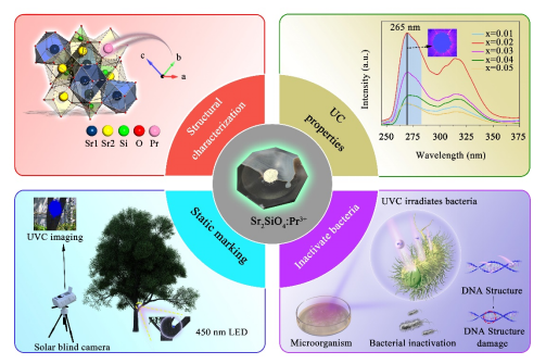 研究表明UVC光子可以破壞微生物中DNA/RNA,考慮到當(dāng)下新冠疫情全球流行的大背景,UVC光子在消殺領(lǐng)域具有十分廣闊的應(yīng)用前景。盡管深紫外發(fā)光二極管被視作最有前景的UVC光源,但是目前因面臨一些技術(shù)上的難題以及某些應(yīng)用場景的限制而阻礙了其大規(guī)模應(yīng)用。本工作中,作者研究了通過上轉(zhuǎn)換方式產(chǎn)生UVC光子的新方法,即將鐠離子摻入到硅酸鍶基質(zhì)中成功制備出一種上轉(zhuǎn)換發(fā)光新材料,該材料可以被450nm激光或LED有效激發(fā)而發(fā)產(chǎn)生UVC光子發(fā)射。同時(shí)進(jìn)一步研究了UVC發(fā)射的泵浦功率依賴關(guān)系和溫度依賴曲線,結(jié)果表明該UVC發(fā)射源于兩光子的上轉(zhuǎn)換過程,且具有較好的熱穩(wěn)定性。此種產(chǎn)生UVC光子的方法除了可應(yīng)用在常規(guī)的靜態(tài)標(biāo)記應(yīng)用,還在動(dòng)態(tài)跟蹤無人機(jī)方面具備潛在應(yīng)用價(jià)值。此外,此種上轉(zhuǎn)換產(chǎn)生UVC光子的方式可以解決UVC光子無法穿透普通玻璃的弊端進(jìn)而實(shí)現(xiàn)對封閉玻璃器皿內(nèi)部空間進(jìn)行紫外消殺,從而證實(shí)了上轉(zhuǎn)換UVC光子方法的獨(dú)特性,使得上轉(zhuǎn)換UVC策略有望成為深紫外發(fā)光二極管的有益補(bǔ)充。
