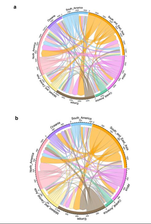 圖為外來種和入侵種貿易的物流網絡:A, 貿易外來種;b, 貿易入侵種