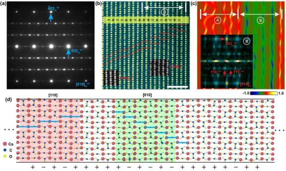 碳酸鈣是自然界中最豐富的無機礦物與生物礦物之一,無水碳酸鈣一般具有方解石、文石、球文石三種晶型,相比于三方晶系的方解石和正交晶系的文石,球文石晶體在獲得X射線圖譜的百年以來,人們發現無論是六方還是正交結構或者其它空間群一直不能完美的描述其結構,球文石晶體結構因此存在著諸多爭議、懸而未決。真實的認識球文石晶體結構,對于其在生物醫藥、生物礦化、精細化工、現代光學等多領域的應用有著廣泛的幫助。由于球文石內部高密度的堆垛無序的結構,導致傳統光源方法面臨著巨大的挑戰,基于此,該項工作綜合利用多尺度透射電子顯微學方法、機器學習、第一性原理計算與分子動力學模擬,在球文石碳酸鈣的鈣原子直接成像基礎上,通過電子衍射和計算模擬,發現其具有多變體的偽六方單斜結構特征,并在原子級尺度上成功解析了其高密度層錯的結構,揭示了碳酸根基團在層間堆垛和層內旋轉的本質原因,這對于解析其他相關多型體結構具有重要意義。