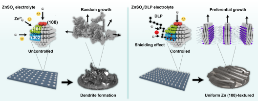 水系鋅離子電池(AZIBs)由于具有低成本、操作安全、環境友好和高容量等優點,被認為是未來新型儲能系統的有力競爭者。然而,鋅負極枝晶的生長是制約鋅離子電池發展的關鍵難題。傳統報道的抑制鋅枝晶的方式是通過控制(002)晶面的沉積來獲得平整的鋅表面,然而(002)晶面的鋅沉積動力學緩慢。前期研究表明(100)晶面的鋅沉積動力學比(002)晶面甚至(101)晶面更快,如能實現(100)晶面的鋅均勻沉積,將使得鋅原子能夠實現超快速的沉積/剝離。但是同時,快速的(100)晶面鋅沉積很難得到控制,從而造成枝晶生長猖獗,因此,實現(100)晶面的鋅均勻沉積充滿挑戰性。該工作通過引入磷酸單十二烷基酯鈉鹽(DLP)作為電解液添加劑,利用DLP中的磷酸基團的強極性選擇性吸附于(002)晶面,而暴露的長鏈碳氫基團能夠有效屏蔽(002)晶面的生長,從而促進了鋅在(100)晶面的擇優生長,最終在鋅負極表面形成了垂直且致密的鋅沉積層,抑制了鋅枝晶的產生。得益于(100)晶面快速的鋅沉積/剝離動力學,該工作實現了超高的鋅沉積/剝離電流密度和高沉積容量,鋅負極在50 mA cm-2的超高電流密度下也能穩定循環。該工作為鋅負極優選晶面沉積提供了新思路,為實現超快鋅沉積/剝離、且無枝晶的鋅負極提供了示范。