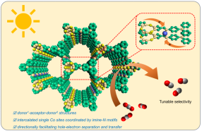 共價有機骨架(COFs)在光催化CO2還原中受到越來越多的關注,但由于活性位點不足和電荷分離過程不理想等問題,其轉化效率仍然較低。D-A型COFs可以顯著改善電子離域,促進分子內電荷轉移,但D-A體系仍易發生快速的逆向電荷轉移,嚴重影響了自由載流子的產生。因此,急需發展新的策略抑制逆向電荷轉移,調控活性位點局域電荷,從而提高COFs光催化CO2的還原活性和選擇性。本工作設計并合成了具有D1-A-D2結構的亞胺COFs,通過引入層間亞胺氮原子配位的Co位點,促進激發態電子轉移過程中電荷分離態的形成,有效誘導電子從雙電子給體向層間Co位點的定向遷移,實現電荷傳遞調控活性位局域電荷分布以提升催化中心對CO2活化及還原的催化效率。光催化活性結果表明,具有D1-A-D2結構的Co/Cu3-TPA-COF表現出優異的光催化CO2還原制合成氣活性,顯著優于大多數已報道的COFs光催化劑;此外,通過引入含不同取代基的聯吡啶添加劑可進一步有效調控合成氣(CO/H2)比例。本項研究工作不僅拓展了COFs催化劑在光催化CO2轉化領域的應用,也為深入理解CO2活性提升機制提供了新的視角。