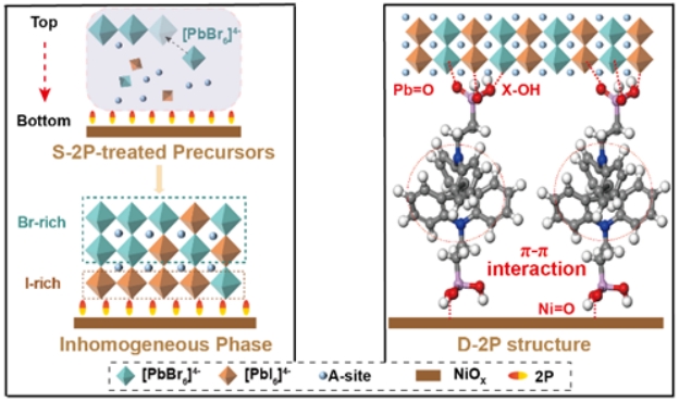 混合鹵素寬帶隙鈣鈦礦材料通常用作疊層太陽能電池的頂部電池。然而,隨著鈣鈦礦材料的光學(xué)帶隙變寬,薄膜的溴含量不可避免地增多,使得寬帶隙光伏器件的Voc損失愈加嚴(yán)重。調(diào)節(jié)混合鹵素鈣鈦礦的結(jié)晶動力學(xué)實(shí)現(xiàn)均勻的鹵素相分布,是混合鹵素寬帶隙鈣鈦礦領(lǐng)域迫切需要解決的難題。在本工作中,作者在鈣鈦礦薄膜埋底界面構(gòu)筑功能化的雙分子層(D-2P)結(jié)構(gòu),為解決這一難題提供新思路。D-2P結(jié)構(gòu)通過位于2P分子頭部的咔唑基團(tuán)之間的強(qiáng)π-π相互作用形成。位于2P分子尾端的磷酸基團(tuán)可以分別錨定NiOx和[PbX6]4-八面體,從而形成穩(wěn)定的鍵橋結(jié)構(gòu)。D-2P結(jié)構(gòu)可以降低Br相和I相鈣鈦礦的形成能,誘導(dǎo)鹵素組分自下而上的均勻結(jié)晶。受益于降低方非輻射復(fù)合和改善的載流子傳輸,D-2P處理的寬帶隙(1.75 eV)鈣鈦礦光伏實(shí)現(xiàn)了20.80%的光電轉(zhuǎn)換效率(經(jīng)第三方認(rèn)證的20.70%),這是該體系目前報(bào)道的最高效率。該工作為進(jìn)一步制備更高性能的寬帶隙鈣鈦礦和疊層光伏器件提供了新策略。