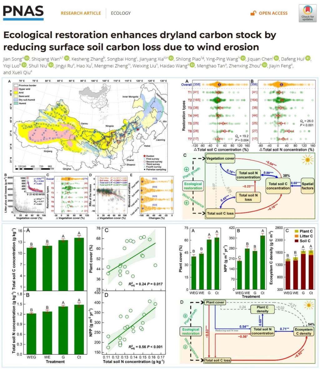 相關(guān)成果"Ecological restoration enhances dryland carbon stock by reducing surface soil carbon loss due to wind erosion"以河北大學(xué)為唯一第一和通訊單位發(fā)表于國際著名綜合性期刊美國國家科學(xué)院院刊《PNAS》(論文詳細信息請見鏈接:https://www.pnas.org/doi/10.1073/pnas.2416281121)。生命科學(xué)學(xué)院宋健研究員為論文第一作者,萬師強教授為通訊作者。原全球變化生態(tài)學(xué)實驗室博士研究生、洛陽理工學(xué)院教師張克勝博士(現(xiàn)任)承擔(dān)了該研究中區(qū)域調(diào)查的主要工作,博士研究生河北大學(xué)茹靖益副研究員和河南師范大學(xué)教師鄭夢眉博士分別主要參與了區(qū)域調(diào)查和野外長期控制實驗的取樣工作。論文共同作者包括華東師范大學(xué)夏建陽教授,北京大學(xué)樸世龍院士、洪松柏研究員和徐浩博士,澳大利亞聯(lián)邦科學(xué)與工業(yè)研究組織(CSIRO)首席研究員王應(yīng)平博士,美國康奈爾大學(xué)駱亦其教授、密歇根州立大學(xué)陳吉泉教授、田納西州立大學(xué)惠大豐教授,中國科學(xué)院地理科學(xué)與資源研究所牛書麗研究員、中國農(nóng)業(yè)科學(xué)院農(nóng)業(yè)資源與農(nóng)業(yè)區(qū)劃研究所劉衛(wèi)星研究員等。
