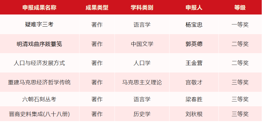 日前,教育部印發(fā)《關(guān)于第九屆高等學(xué)校科學(xué)研究優(yōu)秀成果獎(人文社會科學(xué))獎勵的決定》,我校共有6項成果獲獎,其中一等獎1項、二等獎2項、三等獎3項,創(chuàng)歷史最好成績。高等學(xué)校科學(xué)研究(人文社會科學(xué))優(yōu)秀成果獎是國內(nèi)人文社科研究領(lǐng)域最具公信力和影響力的獎項,代表了人文社會科學(xué)成果的最高水平。