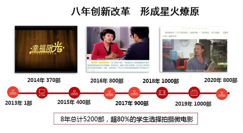 在“繁星獎”河北大學思政課微電影大賽中,教師們指導學生獲得各類各級獎勵近400項。通過微電影教學法,培養學生運用理論解決問題的能力、創造美與體驗美的能力、溝通協作能力、實踐與創新能力和自我教育能力。