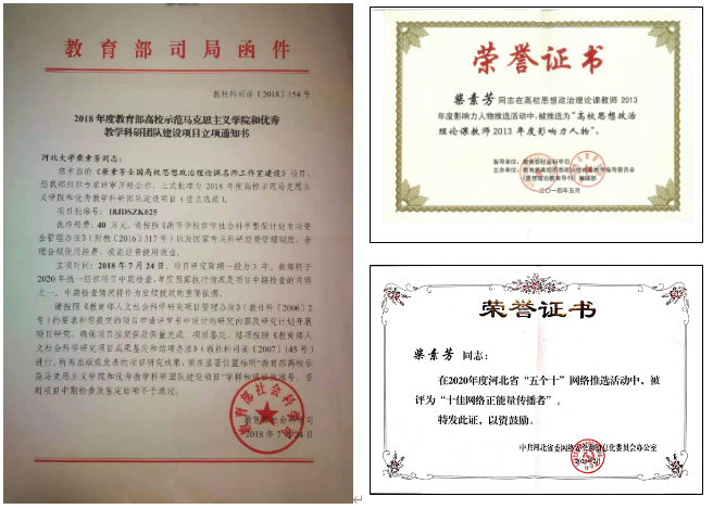負責人柴素芳為“全國高校思政課教師2013年度影響力人物”、“全國高校優秀中青年思想政治理論課教師擇優資助計劃”人選、河北省教學名師、河北省師德標兵、河北省十佳網絡正能量傳播者。2018年,她帶領團隊獲批教育部示范馬克思主義學院與優秀教學科研團隊建設項目(重點)“柴素芳全國高校思想政治理論課名師工作室建設”。