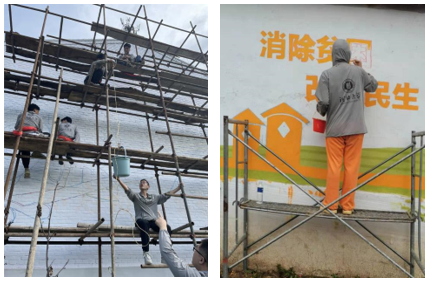 27日晚,經過簡單休整,隊員們便開始了圖案起稿工作,夜幕籠罩的村莊,被一束束投影燈光照亮,腳手架上的身影格外動人。晚上起稿,白天繪制,逐漸成了隊員們既定的節奏。不論烈日酷暑,還是風雨交加,實踐隊員們都沒有一絲抱怨。頭頂烈日,他們在陽光下揮動畫筆;陰雨霏霏,他們在傘下爭分奪秒。28日,下起了淅淅瀝瀝的小雨,雨雖不大,但一直下到深夜,為了不耽誤文化藝術廊道的繪制進程,實踐隊員和帶隊老師們在雨中堅持繪制。